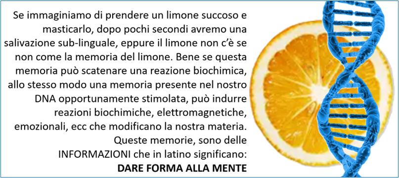 Bene, se questa memoria può scatenare una reazione biochimica, allo stesso modo una memoria presente nel nostro DNA, opportunatamente stimolata può indurre reazioni biochimiche, elettromagnetiche ed emozionali, che modificano la nostra materia.